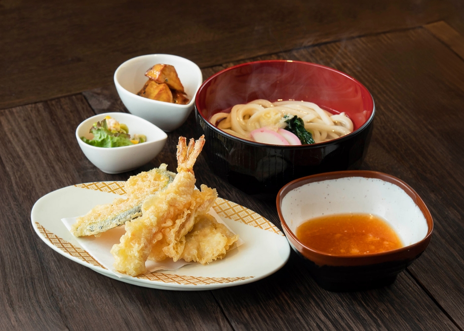 定食のご飯とやまやの辛子明太子、からし高菜は自由におかわりいただけます(店内でのご飲食に限る)。綿実油とコーン油を贅沢に使った特製の油で、香り高くサクサクに揚げた天ぷらを、九州の特産品であるあごを始めとする厳選した6種類の国産だし素材を黄金比でブレンドした「うまだし」に、追い鰹をすることでコク深く仕上げた天つゆでお召しあがりいただけます。