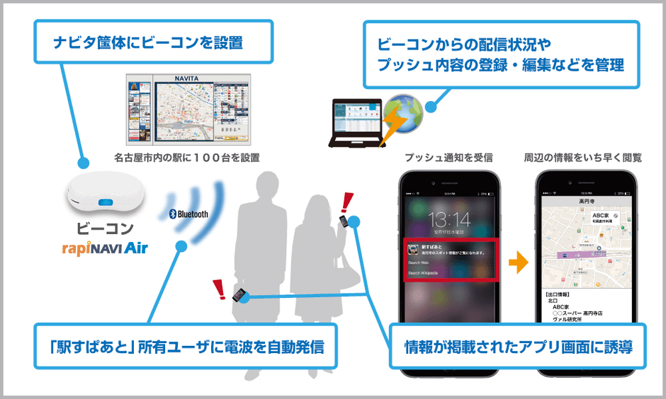 実証実験では、駅周辺案内看板に設置されたMSYS製Beacon端末「RapiNAVI Air」から本日より提供を開始するAndroidスマートフォン用アプリ「駅すぱあと for Android」最新版へ、各駅周辺のMAPや周辺に立地する店舗の情報を発信します。プッシュ通知の受信を許可している端末はこれを受信し、各駅周辺のMAPや周辺に立地する店舗情報をスマートフォン上に表示します。「駅すぱあと for Android」最新版は、「RapiNAVI Air」SDK(*1)を組み込み、「RapiNAVI Air」からの駅周辺情報受信に対応するものです。実際の店舗にも「RapiNAVI Air」を設置することで、駅周辺案内看板から駅周辺情報を受信した人数および、実際の店舗の来店数を計測し、駅周辺情報受信者に対する周辺店舗への誘導効果を測定します。実証実験の期間中には、同じく「RapiNAVI Air」からの駅周辺情報受信に対応したiPhone用アプリ「駅すぱあと for iPhone」最新版もリリースし、併せて効果を測定します。