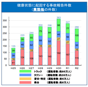 運輸業界ではドライバーの健康起因による事故がやや減少傾向にあります。しかし、業態によっては、増加しています。もっとも多いのは乗合バスのドライバーで、次いでトラックドライバーの順。乗合バスの運転者に対する事故比率は依然として高いままです。トラックの健康起因事故は過去8年で最多となっています。