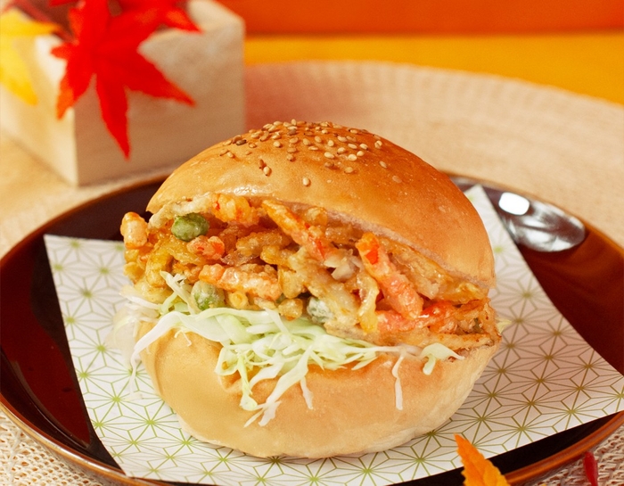 商品特徴:今サクサク食感のかき揚げをふんわりバンズでサンド。香ばしいかき揚げの甘みとツユが絡み、和の旨みが広がる満足バーガー。