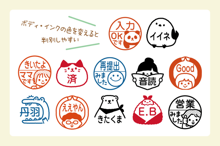 えらべる楽しさと便利さをかなえる全9色のボディカラー。用途や印面のデザインごとに色をかえたり、内容に合わせて色分けをすることもできます。