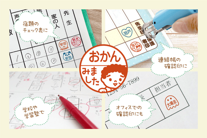 2024年1月に新しいデザインを追加した「みましたスタンプ」。お子さまの連絡帳や音読カードのサイン、塾や学校の先生が提出物に押す確認印に使える、かわいいイラスト入り印鑑です。回覧板のサインやオフィスでのチェック印などにもオススメです。