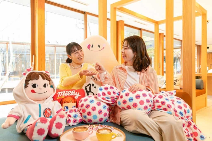 パブリックスペース「TAMARIBA(タマリバ)」に、ミルキーグッズで装飾されたフォトスポットが登場!また、ミルキー柄のトランプやジェンガなど、仲間と一緒だからこそ盛り上がれるコンテンツも用意します。TAMARIBAでくつろいだり、ペコちゃんと一緒に記念撮影をしたり、楽しみ方は自分たち次第!ミルキー尽くしの空間で、ホテルステイを楽しめます。