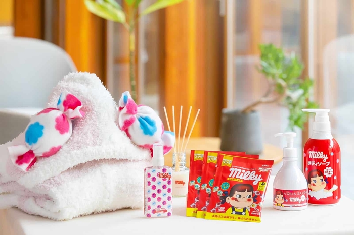 「ミルキースウィートルーム」は、壁面にコラボペコちゃんやミルキー柄をあしらい、ミルキー柄のクッションやペコちゃんのぬいぐるみを設えた、『SWEET(可愛い)』な客室です。客室には、思う存分ミルキーが味わえる「ミルキーウェルカムスウィーツBOX」や甘い香りがする「ミルキー入浴剤」など、ホカンスを楽しめるオリジナルグッズが勢ぞろい。また、ミルキーをイメージした、もこもこのルームウェアは、客室のペコちゃんとおそろいです。さらに今年は、ミルキーを食べるときにやってきて、癒してくれる妖精「ミルキーの精」の大きなクッションも滞在アイテムに仲間入り。体を包みこむ大きくてやわらかいクッションは、一度座ると離れられません。可愛いアイテムに囲まれて、ほっこり癒しのひとときを過ごせます。