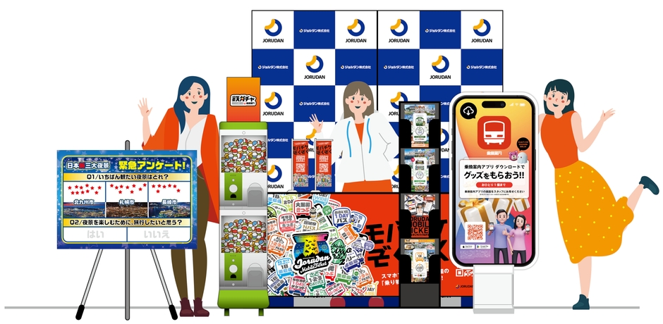 ジョルダンは、自社ブースで経路検索アプリ「乗換案内」をダウンロードしてくれた来場者に対し、「どの夜景を見たいか」などのクイズ形式のアンケートを実施します。回答者にはガチャを引いてもらい、ノベルティを進呈します。当たりガチャは三都市のご当地商品、計6点(1日あたり3点)。外れガチャは、ジョルダン及び各都市のご当地商品をもれなくプレゼントします。