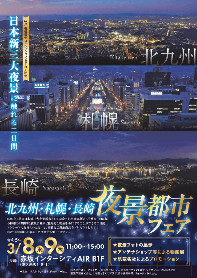 ジョルダン株式会社(本社:東京都新宿区、代表取締役社長:佐藤 俊和、以下「ジョルダン」)は3月8日(水)、9日(木)の2日間、東京都港区赤坂の赤坂インターシティAIRで開催される「北九州・札幌・長崎夜景都市フェア」に出展します。このイベントは「日本新三大夜景」に認定されている3都市が連携し、美しい夜景写真の展示などと物産品販売など多彩なイベントを行い、多くの人たちを夜景見物に誘うものです。入場無料。