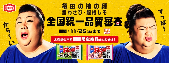 2020年に実施した「亀田の柿の種 何なの?問題キャンペーン」で「わさび味はもっと辛く!」、「梅しそ味はもっとすっぱく!」という声が多数寄せられました。これを受け、お客様が食べてみたい「亀田の柿の種」のわさび味の辛さレベルと梅しそ味の酸味レベルを問う「亀田の柿の種 超わさび・超梅しそ 全国統一品質審査」を2021年9月に実施しました。