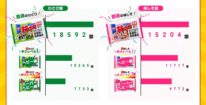 その結果、「普通のわさび」は18,592票で、辛さレベル1(10,265票)、レベル2(7,733票)と約2倍の投票差を獲得。「普通の梅しそ」は15,204票を獲得し、酸味レベル1(11,717票)、レベル2(9,772票)に差をつけ、皆さまに今まで通りの辛さとすっぱさを最もご支持いただきました。