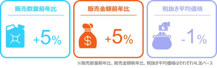 2025年1月の自動車用エンジンオイルの4L缶販売は、数量前年比5%増と前年を上回り、店頭では同5%増、インターネットでは同12%増であった。4L缶の主要な粘度では、0W-20が数量前年比1%減であったが、5W-30が同6%増、0W-16は同18%増と伸長した。4L缶の税抜き平均価格は4,072円と前年同月から1%下落し、店頭では前年並みであったものの、インターネットでは4%下落した。4L缶全体の金額前年比は5%増となり、店頭では4%増、インターネットでは7%増であった。