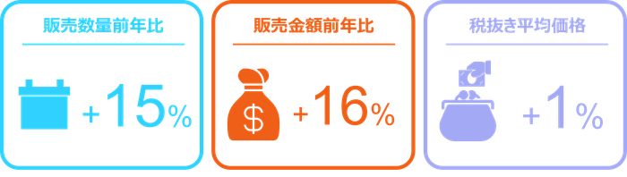 2025年1月の自動車用バッテリー販売は数量前年比15%増と二桁成長であった。店頭では同5%増にとどまったが、インターネットでは同30%増に至った。JIS規格別にみると、B20が数量前年比37%増と著しい伸長を見せた。販売規模は大きくないもののEN規格も数量前年比48%増と大幅な成長を遂げた。バッテリー全体の平均価格は前年同月から1%上昇し13,410円となり、店頭では4%、インターネットでは1%上昇した。金額前年比では16%増と好調で、店頭では9%増、インターネットでは30%増であった。