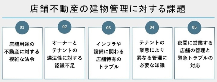 店舗不動産に特化した全国規模の建物管理会社は皆無に等しいといえます。その要因は、一般的な流通不動産であるオフィス、レジデンスと比較して、「店舗不動産」は不特定多数の来客を前提としているため、建築基準法や消防法では厳しい安全基準が定められており、複雑な法令、店舗特有のトラブルと専門性を要する対応、業態の多様化、用途変更の繰返しなど管理する難しさが上げられるためです。しかし、法令改正前に着工した建物は、テナントの内装工事や業態変更や増改築によって、現状の基準法には沿わなくなっている店舗不動産はめずらしくなく、本来、このような店舗ビルは、共用部はもちろん、賃貸区分も含めた建物全体を関係法規、条例に適合した状態に是正しなければなりません。