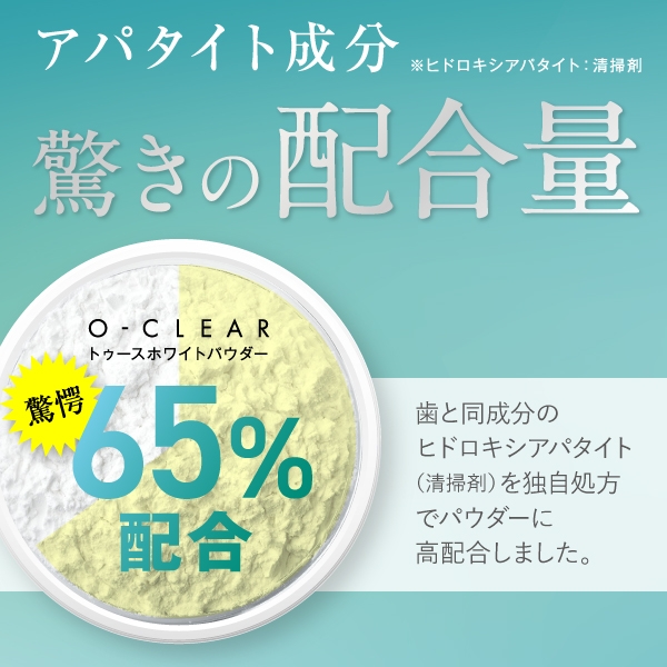 歯と同成分、ヒドロキシアパタイト(清掃剤)を独自処方でパウダーに高配合。細かい粒子が歯の隅々まで入り込み歯垢を除去。気になる口臭予防にも。