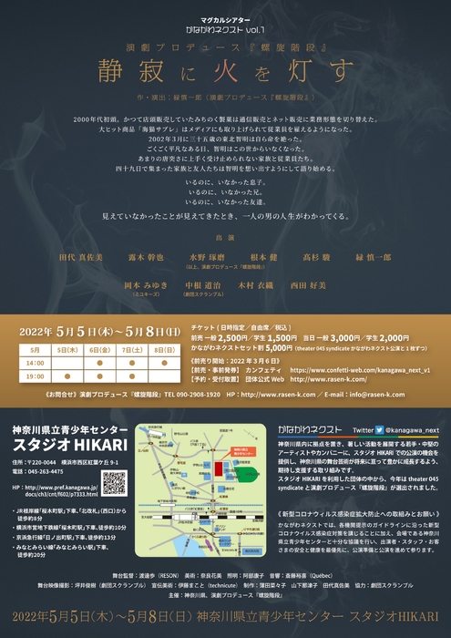 神奈川県・演劇プロデュース『螺旋階段』主催、演劇プロデュース『螺旋階段』かながわネクストvol.1『静寂に火を灯す』が2022年5月5日 (木・祝) ~2022年5月8日 (日)に神奈川県立青少年センタースタジオHIKARI(神奈川県横浜市)にて上演されます。チケットはカンフェティ(運営:ロングランプランニング株式会社、東京都新宿区、代表取締役:榑松 大剛)にて発売中です。