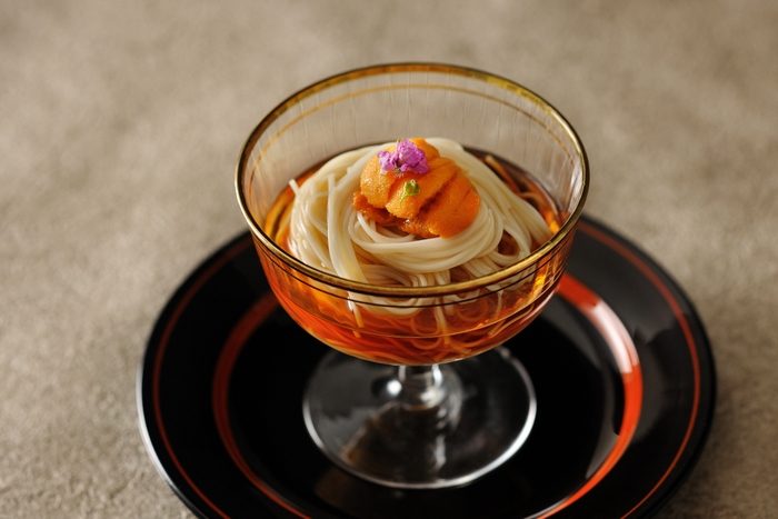 お造りや先付けでは馬肉を提供します。お造りの馬刺しは、なめ茸とごま油、米酢を合わせた特製のたれで味わいます。先付けは「からし蓮根と馬肉のタルタル仕立て」。郷土料理のからし蓮根と、雄大な草原で育った馬肉の阿蘇らしい食材の組み合わせです。またお凌ぎでは、徳川将軍や明治天皇にも献上された、約300年の歴史を持つ「南関そうめん」を提供します。手作業で作られたコシのある麺が特徴で、雲丹と出汁をからめて味わいます。