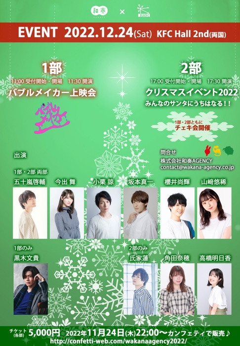 『和奏AGENCY × 五十嵐家 1部:バブルメイカー上映会 2部:クリスマスイベント2022みんなのサンタにうちはなる!!』が2022年12月24日(土)にKFC Hall 2nd(東京都墨田区)にて開催されます。チケットはカンフェティ(運営:ロングランプランニング株式会社、東京都新宿区、代表取締役:榑松 ⼤剛)にて11月24日(木) 22:00より発売開始です。