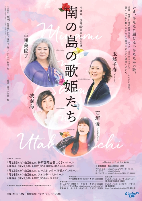 民音は、沖縄本土復帰50周年を記念して、沖縄・奄美出身の女性歌手4名による「南の島の歌姫たち」コンサートを開催します。