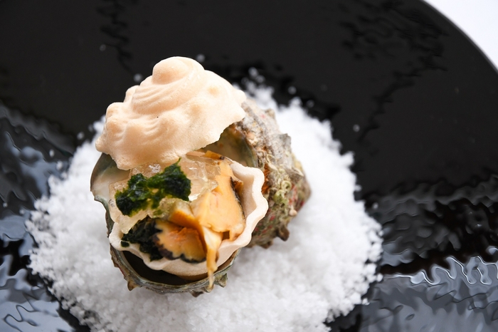 シェフの鈴木が五島市を訪ね、出会ったのは地元の銘菓「サザエ最中」。全国一の水揚げ量を誇る名産物のサザエを模した、昔ながらのお菓子であるこの「サザエ最中」にインスピレーションを受け、サザエの形をした最中の皮のみを使い、五島産の新鮮なサザエと合わせた鈴木のアイデアが光る個性的な一品です。