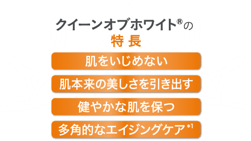 *1 年齢に応じたスキンケア *2 ホワイトニングローション、ホワイトニングエッセンス/メラニンの生成を抑え、シミ・そばかすを防ぐ *3 林檎果実培養細胞エキス(保湿成分) *4 角質層まで