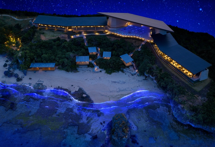 入り江に沿った崖の上に立つバンタカフェの目の前には、サンゴ礁に囲まれた遠浅の海「イノー」が広がります。期間中は、目の前に広がる海がライトアップされ、青く光るイノーに白く輝く波が打ち寄せる幻想的な景色が広がります。浜辺に降りて光る海と戯れたり、高台にある「大屋根デッキ」で星空を眺めながら響き渡る波音に包まれたり、海辺の自然を活かしたイルミネーションが楽しめます。