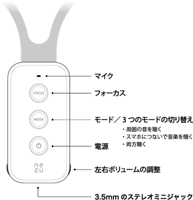 Vibone Nezuの操作は、フロントパネルに配置された3つのボタンと側面の下部に設けられたダイアルで行います。一番下のボタンは電源のオンオフを行うメインスイッチ。真ん中のボタンは①集音機能と②スマートホンなどを接続する外部端末連携機能、③集音機能+外部単滅連携機の3つのモードを切り替えるスイッチ。一番上のボタンは状況に応じてマイク感度が切り替えられるフォーカススイッチ。さらに、筐体の下部には左右それぞれ独立して音量調節ができるボリュームダイアルがあります。