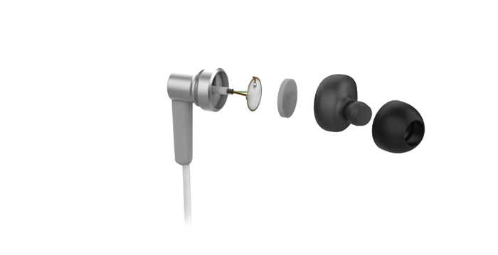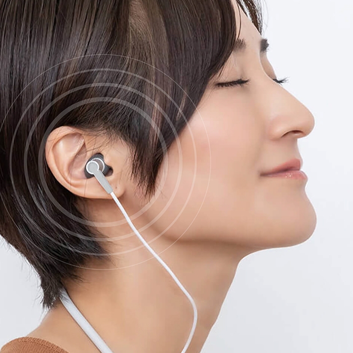 より良い聴こえのため、骨伝導イヤホンは密着し固定することが重要です。イヤホンは直接耳に触れるものだけに、皮膚への刺激や負担を最小限にすることも求められます。そうした目的で選んだ素材がシリコーンです。イヤホンのボディには皮膚との音響インピーダンスと抗菌性を考えて硬度30 の銀イオンを混込んだ抗菌シリコーンを、振動子ユニットには圧電セラミックス振動子の歪みを妨げずパワーを伝え、完全密閉で音漏れを防ぐ硬度 30 のシリコーンを採用するなど、安全への配慮と高次元な性能を両立しました。