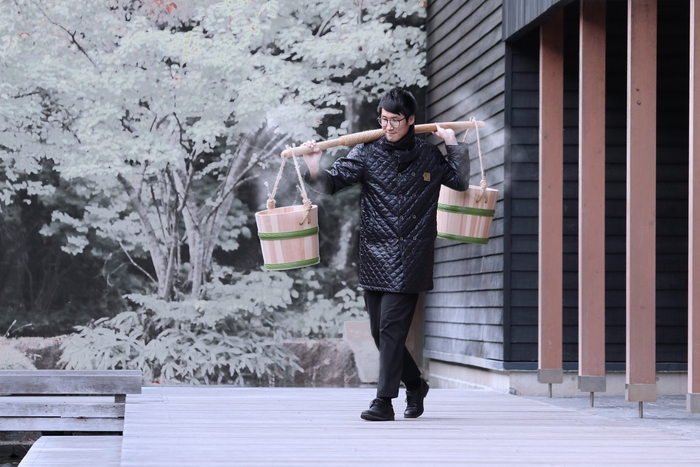 開催時の外気温に応じて、最適な温度の足湯を用意します。また、足湯に浸かってから少し時間がたち、湯温が下がり始める頃合いをみて、トンボの湯の湯守スタッフが天秤棒を担いで温泉を運び、足湯の温泉を入れ替えます。そうすることで、40度以上の湯温が保たれるため、心地よい温かさの足湯をゆっくりと楽しむことができます。