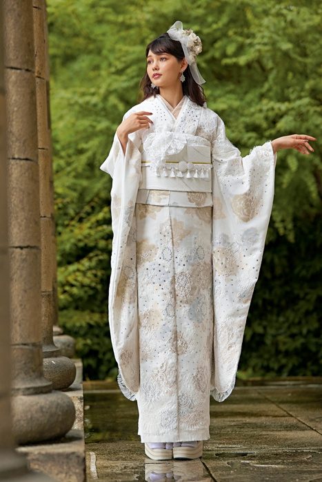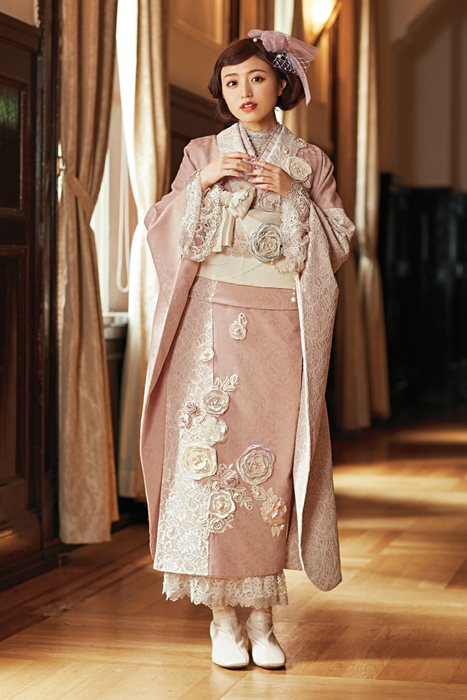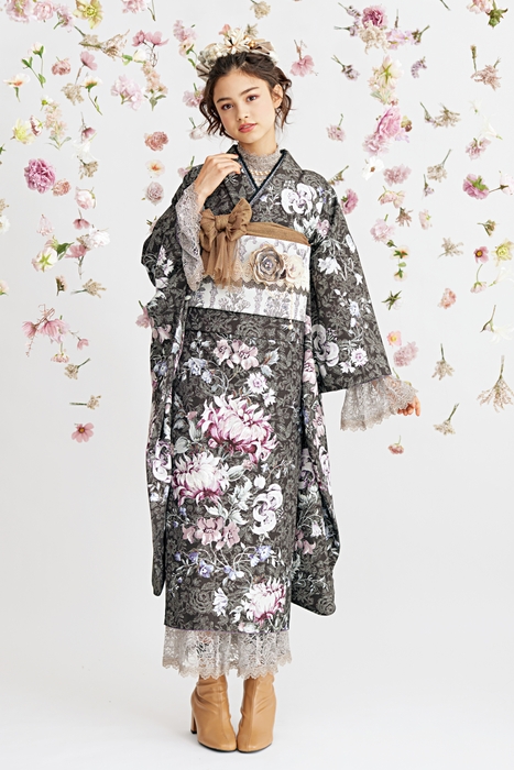 立体的な花モチーフをあしらった、クラフト感のある着物でフレンチシネマの主役のような、"大人かわいい" を手に入れて。