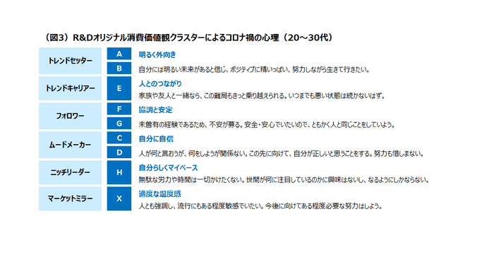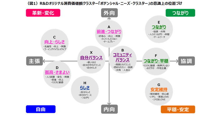 株式会社リサーチ・アンド・ディベロプメント(所在地:東京都新宿区、代表取締役:松田 武久)は、全国の20~39歳男女を対象に、新型コロナウイルス流行下における生活の変化と今後の意識について調査を行い、独自の生活価値観クラスター「ポテンシャル・ニーズ・クラスター」(図1、2)により、新型コロナ禍での価値観の違いによる意識や行動の差異を分析しました。
