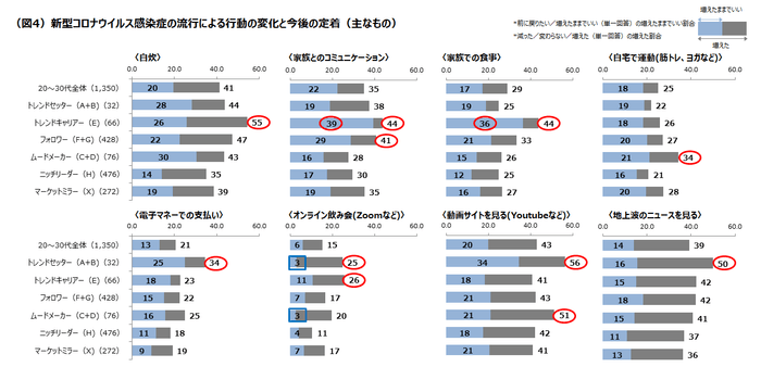 新しい商品や情報に飛びつく前向きなクラスター「トレンドセッター」は、明るい未来を切り開くために努力する層。コロナ禍の生活では、動画サイトや地上波ニュースによる情報収集、電子マネーの利用が他のクラスターに先んじていた。オンライン飲み会の参加率も高かったが、今後の継続利用意向は低く、一時的な流行に留まる可能性が高い。