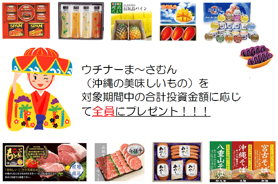 対象期間中の合計投資金額(50万円以上が対象)に応じた、沖縄の美味しい県産品をプレゼント致します。