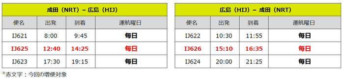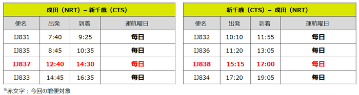スプリング・ジャパン株式会社(本社:千葉県成田市、代表取締役社長:米澤 章、以下:スプリング・ジャパン)は2022年10月30日~12月31日の期間において、成田=新千歳線、広島線を以下の通り増便いたします。