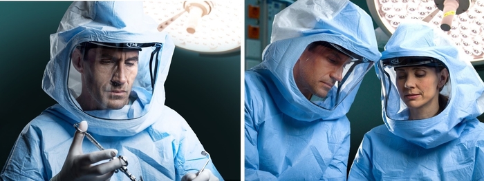 ヘルメットを着用した外科医はフードと呼ばれる特別な滅菌カバーで保護され、患者から十全に隔離されます。
