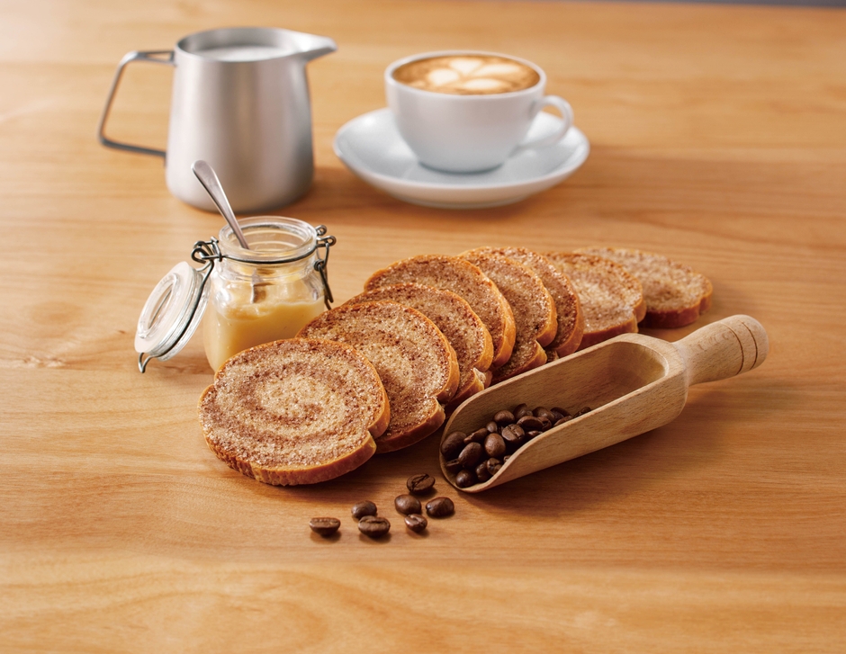 ラスクに使用するフランスパンは、カフェラテ風味を感じていただけるように、生地に牛乳を加えてミルクジャムの濃厚なミルク感を引き出し、甘みと苦みのバランスを整えました。