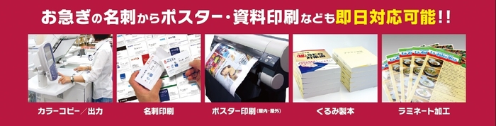 名刺・製本・資料印刷といったビジネスのサポートだけでなく、ポスター・パネル作成などイベントの販促に活用できる商品も広く取り扱っております。