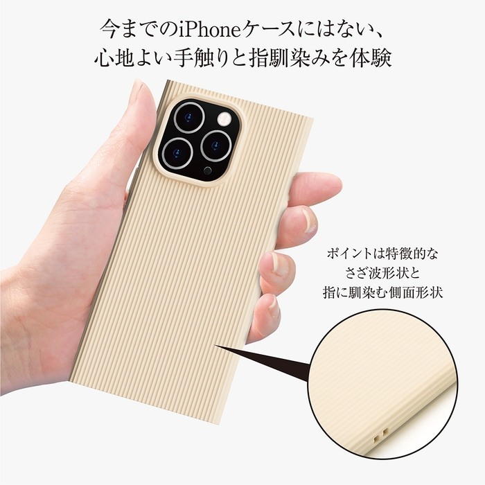 ケース全周に施された細かいさざ波のような形状と側面のしなやかな曲面が手のひらに馴染むことで絶妙な持ちやすさを実現しています。
