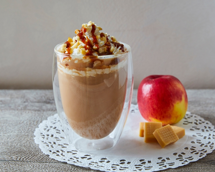 キャラメルソースにホイップクリームをのせた、りんごの風味が香る単品デザートミルクティーです。香ばしいバタークッキーのサクサクとした食感もアクセントとなっています。③同様、カスタマイズも可能です。