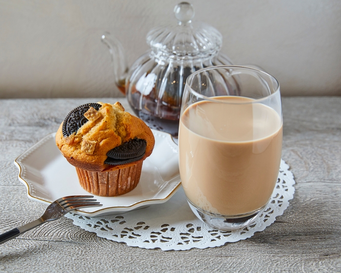 ココアビスケットをのせ焼き上げた大きなマフィンと、アッサム産茶葉を使用したミルクティーのセットメニューです。ミルクティーは無糖のため、ガムシロップのほか、カロリーや糖類を抑えた甘味料の追加などお好みでカスタマイズも可能です。