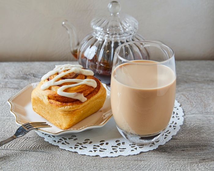 アイシングシュガーの甘みとシナモンの風味がたまらない大きなシナモンロールと、アッサム産茶葉を使用したミルクティーのセットメニューです。➀同様、カスタマイズも可能です。