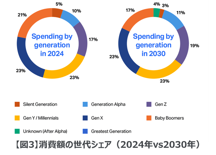 現在、Z世代は世界の消費総額(57兆6,000億ドル)の約17%を占め、今後6年でその割合は19%に達すると予測されています(図3)。