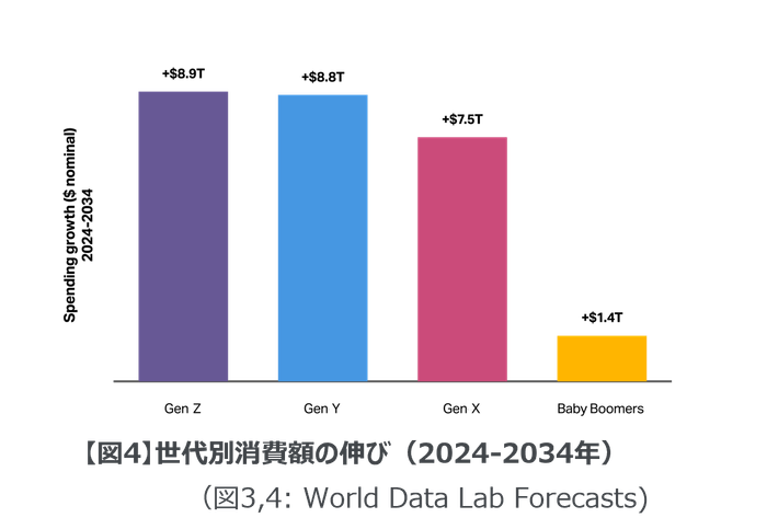 また、今後10年間で最も消費額の伸びが顕著な世代となるとされています(図4)。このような背景から、Z世代の消費動向を理解し、迅速に対応することが、企業にとってますます重要な課題となっています。