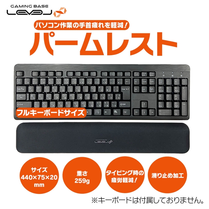 パソコン工房セレクト商品『パームレスト』は、パソコン作業をしている手首が保護されて疲労軽減や長時間の作業がしやすくなります。パームレストをキーボードの手前に置き、手首をのせて利用します。長時間のキーボード操作をする方におすすめです。滑り止め加工で、サイズはテンキーレスサイズとフルキーボードサイズの2種類となります。