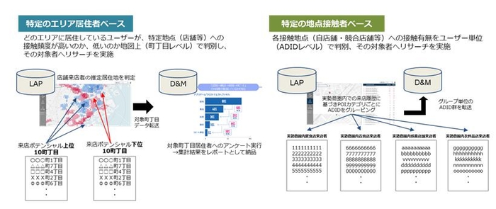 本業務提携により、クロスロケーションズが開発・提供する匿名位置情報データ活用クラウド型プラットフォーム「Location AI Platform™ (ロケーションエーアイプラットフォーム、以下「LAP」) 」(※)による位置情報ビッグデータからの解析結果とリサーチサービスを組み合わせることで、「特定のエリア居住者グループ」および「特定の地点接触者グループ」の位置情報データを活用し、スーパーやコンビニエンスストアなどの店舗を利用した消費者グループがどのエリアに住んでいて、どのように行動しているかの分析が可能になります。また位置情報ビッグデータを利用しているため、自社の来店者分析だけでなく、競合他社の店舗の来店者分析もできるため、自社の店舗の現状把握から、新規顧客の開拓・既存顧客のリピート促進・広告による集客効率の向上といったマーケティング課題の解決に繋がる施策の導出を行います。
