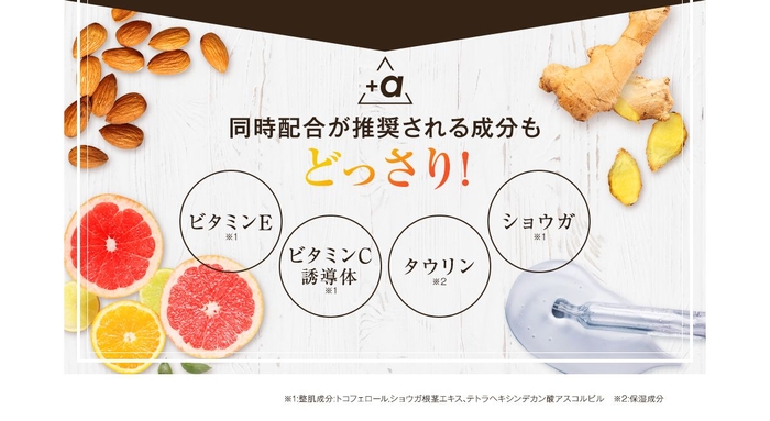 上記3成分のみならず、ビタミンE、ビタミンC誘導体、タウリン、ショウガといったその他の有効成分もしっかりと配合しています。