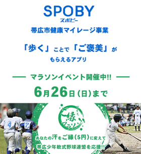 「第一回とかちご縁マラソン」あなたの汗を5円で買取ります、と銘打ち市民の活動増進はもとより、地域社会の活性化を図ります。「クラウドマラソン」とは、開催地を訪れることなく参加できるアプリ上のマラソンイベントです。参加ユーザーは一日5kmを歩行または走行すると、アプリSPOBYがユーザーに代わり地域へ5円を寄付をいたします。今回集まった金額は帯広少年野球連盟に全て寄付し、毎月地域スポーツ団体を変えながら当イベントを実施していまいります。