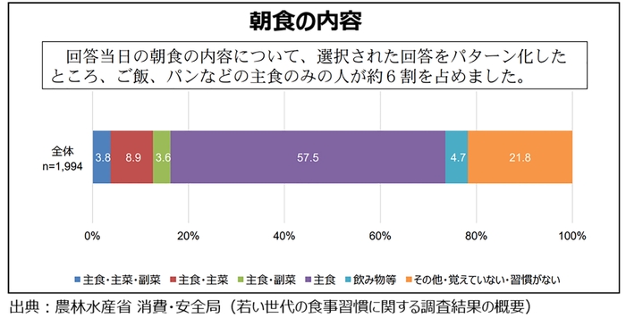 しかし、2019年に農林水産省が18~39歳男女約2000名を対象に朝食の内容を調査した結果によると、60%近くの人が「朝食は主食のみ」と回答。炭水化物に偏った食事をしており、子どもの食事も同様の傾向があると考えられます