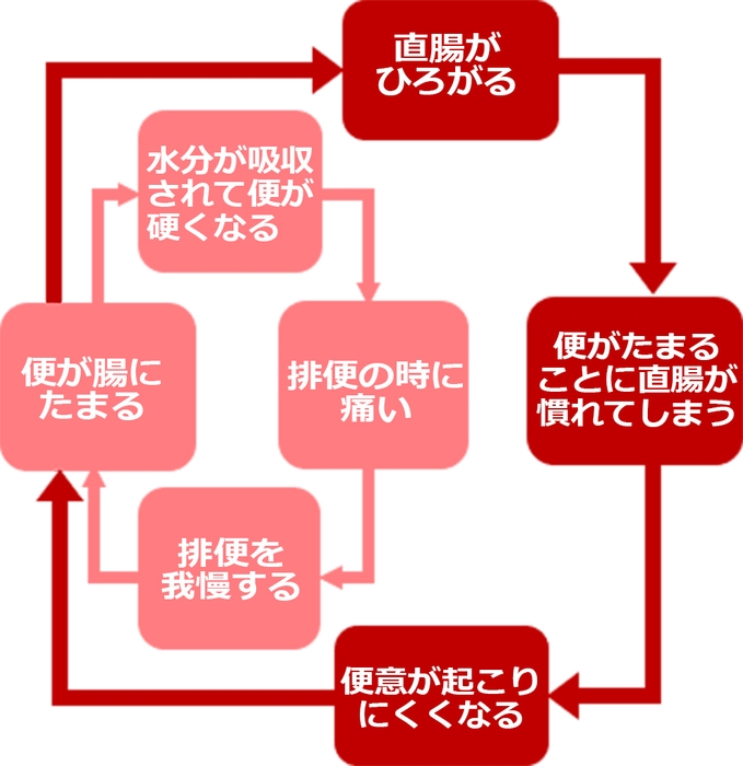 「痛みを伴う排便を経験するとついつい我慢をしてしまい、 慢性的な便秘に発展してしまう場合があります。さらに、常に便が直腸にある状態が続くと、腸がだんだん鈍感になり、便意が起こりにくくなります。すると、ますます便が硬くなりたまってしまう、といった悪循環が起き”便秘の2重ループ”に陥ることも。この悪循環が続くと、直腸や結腸が次第に拡大して巨大結腸となり、大腸内に巨大な便の塊ができた結果、少量の便が漏れでる「遺糞症」となることもあります。」