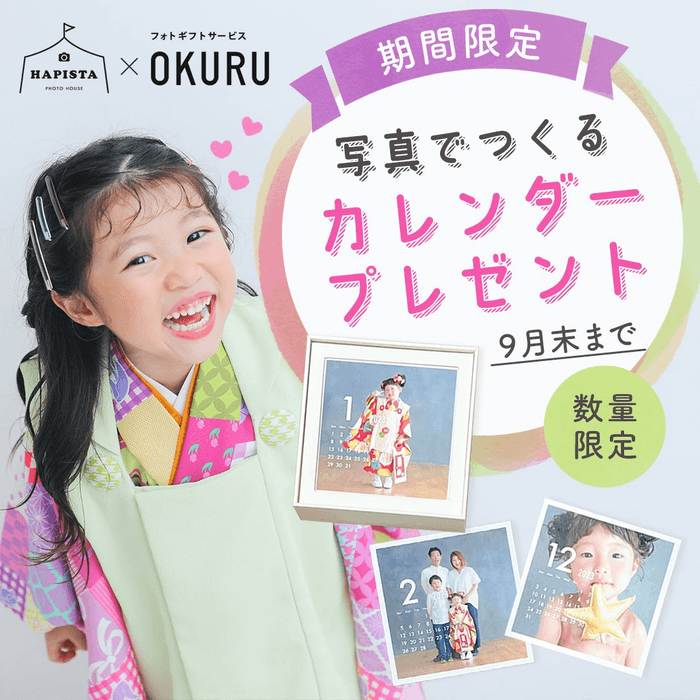 株式会社デコルテ(本社:兵庫県芦屋市、以下デコルテ)が運営するアニバーサリーフォトスタジオ「HAPISTA(ハピスタ)」は、株式会社スフィダンテ(本社:東京都渋谷区、以下スフィダンテ)が運営するフォトギフトサービス「OKURU(オクル)」とコラボレーションを実施。HAPISTAで撮影された方を対象に、「写真でつくるカレンダー」のプレゼントを数量限定で開始しました。