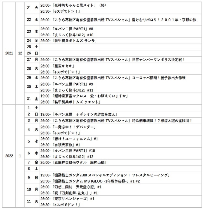 全国無料放送のBS12 トゥエルビ( 本社:東京都渋谷区、代表取締役社長:須磨直樹)では、好評放送中の「日曜アニメ劇場」「アニメ26」を中心に年末年始を彩るアニメ編成を予定しております。
