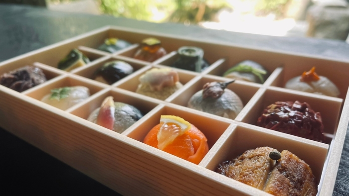 生湯葉、生麩など京都ならではの素材や、季節に応じた旬の食材を使ったお寿司は味だけでなく見た目も楽しませてくれる逸品となっております。