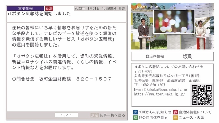 株式会社広島ホームテレビ(広島市中区/代表取締役社長:三吉 吉三)が新たに提供する新サービス「dボタン広報誌」の運用が、本日(2023年2月1日)、坂町(広島県安芸郡)でスタートしました。